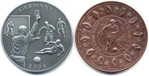 Liberia no participó en el Mundial de fútbol de Alemania 2006, eso no fue óbice para que el los liberianos emitiesen una moneda conmemorativa. En el anverso un árbitro sacando una tarjeta, en el reverso el mapa de Alemania rodeado por los estadios donde se celebró la copa del mundo.